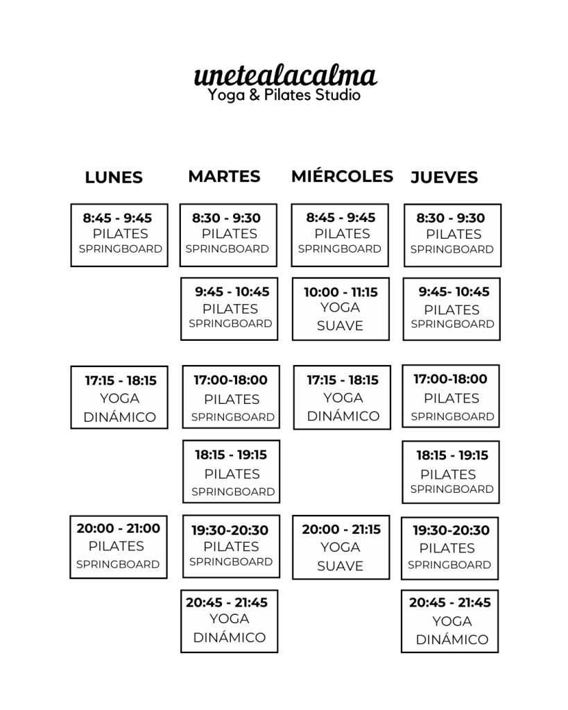 Clases de Pilates Mat (esterilla en suelo) y clases con Springboard (unidad de pared con muelles).